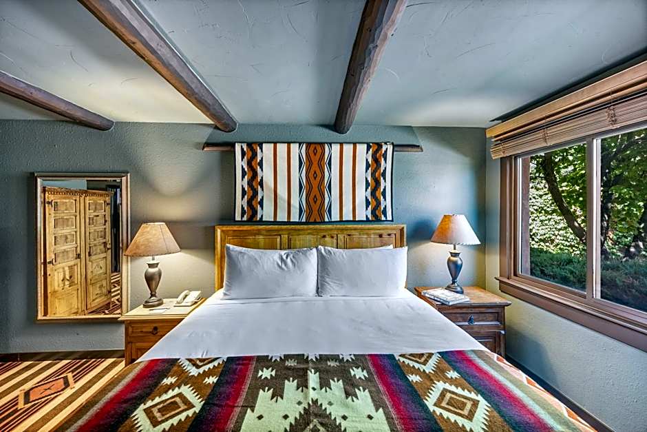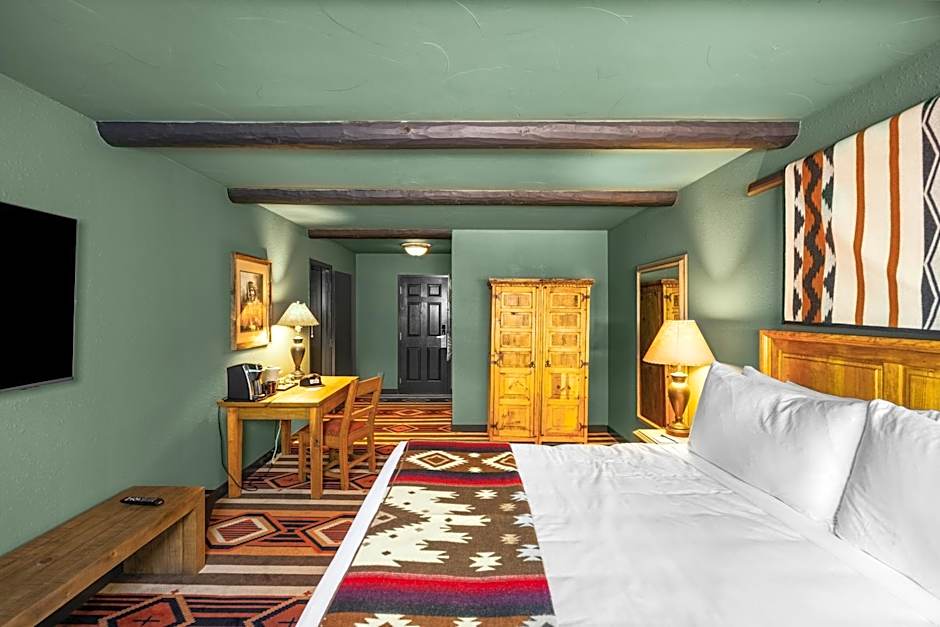 This spacious suite features a hot tub, sofa bed, and separate dining area. A kiva fireplace is also included.